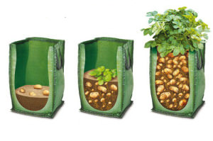 Другой способ: в специальный мешок насыпаете 10 см почвы и кладете проросший клубень. Когда отростки, достигнут 7 см, посыпаете почву, и окучиваете, и так пока почва не поднимется до отметки 10 см от верхнего края мешка.