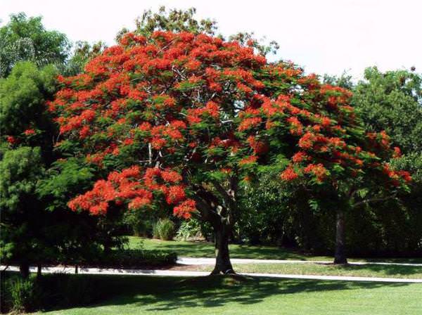 Здравствуйте, уважаемые любители ландшафтного дизайна и профессионалы! Недавно мельком увидела то ли рекламу, то ли передачу о красивом дереве. Единственное, что о нем запомнила, это то что в названии были слова “королевское дерево” и что это самое красивое из цветущих деревьев мира. На фото — или видеосъемке дерева в цвету создавалось ощущение, что у него цветы расположены по всей кроне, листьев вообще не видно было — сплошь красные цветы плотным слоем. Помогите определить что это за дерево и возможно ли его вырастить в уральском климате? Хотелось бы вырастить его в своем саду. Ну очень запало в душу!
